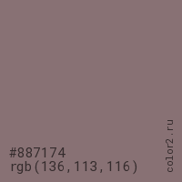 Цвет #887174 в цветовой модели RGB обозначается тремя октетами (136, 113, 116) в десятичном формате и #887174 в шестнадцатиричном (hex) формате, которые являются интенсивностью красного 136 (hex 88), интенсивность зелёного 113 (hex 71) и интенсивность синего 116 (hex 74).