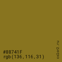 Цвет #88741F в цветовой модели RGB обозначается тремя октетами (136, 116, 31) в десятичном формате и #88741F в шестнадцатиричном (hex) формате, которые являются интенсивностью красного 136 (hex 88), интенсивность зелёного 116 (hex 74) и интенсивность синего 31 (hex 1F).
