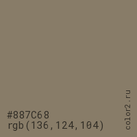 Цвет #887C68 в цветовой модели RGB обозначается тремя октетами (136, 124, 104) в десятичном формате и #887C68 в шестнадцатиричном (hex) формате, которые являются интенсивностью красного 136 (hex 88), интенсивность зелёного 124 (hex 7C) и интенсивность синего 104 (hex 68).