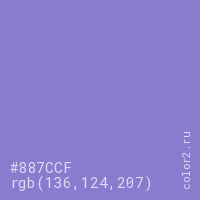 Цвет #887CCF в цветовой модели RGB обозначается тремя октетами (136, 124, 207) в десятичном формате и #887CCF в шестнадцатиричном (hex) формате, которые являются интенсивностью красного 136 (hex 88), интенсивность зелёного 124 (hex 7C) и интенсивность синего 207 (hex CF).