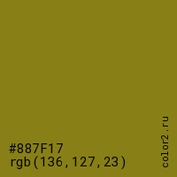Цвет #887F17 в цветовой модели RGB обозначается тремя октетами (136, 127, 23) в десятичном формате и #887F17 в шестнадцатиричном (hex) формате, которые являются интенсивностью красного 136 (hex 88), интенсивность зелёного 127 (hex 7F) и интенсивность синего 23 (hex 17).