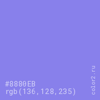 Цвет #8880EB в цветовой модели RGB обозначается тремя октетами (136, 128, 235) в десятичном формате и #8880EB в шестнадцатиричном (hex) формате, которые являются интенсивностью красного 136 (hex 88), интенсивность зелёного 128 (hex 80) и интенсивность синего 235 (hex EB).