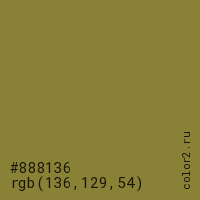 Цвет #888136 в цветовой модели RGB обозначается тремя октетами (136, 129, 54) в десятичном формате и #888136 в шестнадцатиричном (hex) формате, которые являются интенсивностью красного 136 (hex 88), интенсивность зелёного 129 (hex 81) и интенсивность синего 54 (hex 36).