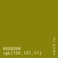 Цвет #88830B в цветовой модели RGB обозначается тремя октетами (136, 131, 11) в десятичном формате и #88830B в шестнадцатиричном (hex) формате, которые являются интенсивностью красного 136 (hex 88), интенсивность зелёного 131 (hex 83) и интенсивность синего 11 (hex 0B).