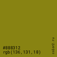 Цвет #888312 в цветовой модели RGB обозначается тремя октетами (136, 131, 18) в десятичном формате и #888312 в шестнадцатиричном (hex) формате, которые являются интенсивностью красного 136 (hex 88), интенсивность зелёного 131 (hex 83) и интенсивность синего 18 (hex 12).