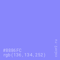 Цвет #8886FC в цветовой модели RGB обозначается тремя октетами (136, 134, 252) в десятичном формате и #8886FC в шестнадцатиричном (hex) формате, которые являются интенсивностью красного 136 (hex 88), интенсивность зелёного 134 (hex 86) и интенсивность синего 252 (hex FC).