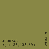 Цвет #888745 в цветовой модели RGB обозначается тремя октетами (136, 135, 69) в десятичном формате и #888745 в шестнадцатиричном (hex) формате, которые являются интенсивностью красного 136 (hex 88), интенсивность зелёного 135 (hex 87) и интенсивность синего 69 (hex 45).