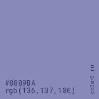 Цвет #8889BA в цветовой модели RGB обозначается тремя октетами (136, 137, 186) в десятичном формате и #8889BA в шестнадцатиричном (hex) формате, которые являются интенсивностью красного 136 (hex 88), интенсивность зелёного 137 (hex 89) и интенсивность синего 186 (hex BA).