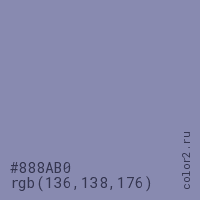Цвет #888AB0 в цветовой модели RGB обозначается тремя октетами (136, 138, 176) в десятичном формате и #888AB0 в шестнадцатиричном (hex) формате, которые являются интенсивностью красного 136 (hex 88), интенсивность зелёного 138 (hex 8A) и интенсивность синего 176 (hex B0).