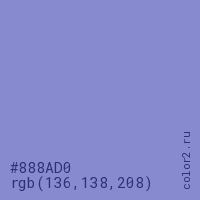 Цвет #888AD0 в цветовой модели RGB обозначается тремя октетами (136, 138, 208) в десятичном формате и #888AD0 в шестнадцатиричном (hex) формате, которые являются интенсивностью красного 136 (hex 88), интенсивность зелёного 138 (hex 8A) и интенсивность синего 208 (hex D0).