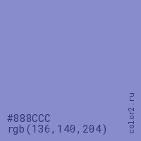 Цвет #888CCC в цветовой модели RGB обозначается тремя октетами (136, 140, 204) в десятичном формате и #888CCC в шестнадцатиричном (hex) формате, которые являются интенсивностью красного 136 (hex 88), интенсивность зелёного 140 (hex 8C) и интенсивность синего 204 (hex CC).