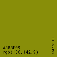 Цвет #888E09 в цветовой модели RGB обозначается тремя октетами (136, 142, 9) в десятичном формате и #888E09 в шестнадцатиричном (hex) формате, которые являются интенсивностью красного 136 (hex 88), интенсивность зелёного 142 (hex 8E) и интенсивность синего 9 (hex 09).