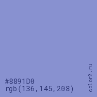 Цвет #8891D0 в цветовой модели RGB обозначается тремя октетами (136, 145, 208) в десятичном формате и #8891D0 в шестнадцатиричном (hex) формате, которые являются интенсивностью красного 136 (hex 88), интенсивность зелёного 145 (hex 91) и интенсивность синего 208 (hex D0).