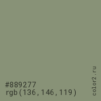 Цвет #889277 в цветовой модели RGB обозначается тремя октетами (136, 146, 119) в десятичном формате и #889277 в шестнадцатиричном (hex) формате, которые являются интенсивностью красного 136 (hex 88), интенсивность зелёного 146 (hex 92) и интенсивность синего 119 (hex 77).