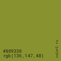 Цвет #889330 в цветовой модели RGB обозначается тремя октетами (136, 147, 48) в десятичном формате и #889330 в шестнадцатиричном (hex) формате, которые являются интенсивностью красного 136 (hex 88), интенсивность зелёного 147 (hex 93) и интенсивность синего 48 (hex 30).