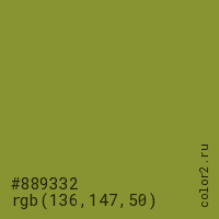 Цвет #889332 в цветовой модели RGB обозначается тремя октетами (136, 147, 50) в десятичном формате и #889332 в шестнадцатиричном (hex) формате, которые являются интенсивностью красного 136 (hex 88), интенсивность зелёного 147 (hex 93) и интенсивность синего 50 (hex 32).