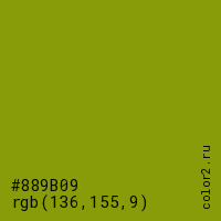Цвет #889B09 в цветовой модели RGB обозначается тремя октетами (136, 155, 9) в десятичном формате и #889B09 в шестнадцатиричном (hex) формате, которые являются интенсивностью красного 136 (hex 88), интенсивность зелёного 155 (hex 9B) и интенсивность синего 9 (hex 09).