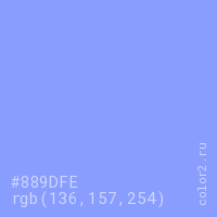 Цвет #889DFE в цветовой модели RGB обозначается тремя октетами (136, 157, 254) в десятичном формате и #889DFE в шестнадцатиричном (hex) формате, которые являются интенсивностью красного 136 (hex 88), интенсивность зелёного 157 (hex 9D) и интенсивность синего 254 (hex FE).