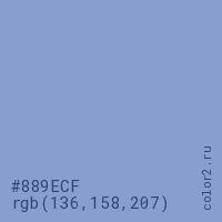 Цвет #889ECF в цветовой модели RGB обозначается тремя октетами (136, 158, 207) в десятичном формате и #889ECF в шестнадцатиричном (hex) формате, которые являются интенсивностью красного 136 (hex 88), интенсивность зелёного 158 (hex 9E) и интенсивность синего 207 (hex CF).