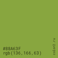 Цвет #88A63F в цветовой модели RGB обозначается тремя октетами (136, 166, 63) в десятичном формате и #88A63F в шестнадцатиричном (hex) формате, которые являются интенсивностью красного 136 (hex 88), интенсивность зелёного 166 (hex A6) и интенсивность синего 63 (hex 3F).