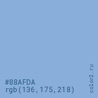 Цвет #88AFDA в цветовой модели RGB обозначается тремя октетами (136, 175, 218) в десятичном формате и #88AFDA в шестнадцатиричном (hex) формате, которые являются интенсивностью красного 136 (hex 88), интенсивность зелёного 175 (hex AF) и интенсивность синего 218 (hex DA).