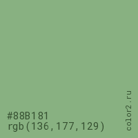 Цвет #88B181 в цветовой модели RGB обозначается тремя октетами (136, 177, 129) в десятичном формате и #88B181 в шестнадцатиричном (hex) формате, которые являются интенсивностью красного 136 (hex 88), интенсивность зелёного 177 (hex B1) и интенсивность синего 129 (hex 81).