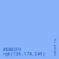 Цвет #88B2F9 в цветовой модели RGB обозначается тремя октетами (136, 178, 249) в десятичном формате и #88B2F9 в шестнадцатиричном (hex) формате, которые являются интенсивностью красного 136 (hex 88), интенсивность зелёного 178 (hex B2) и интенсивность синего 249 (hex F9).