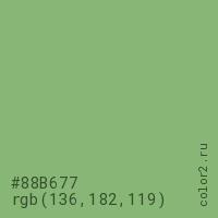 Цвет #88B677 в цветовой модели RGB обозначается тремя октетами (136, 182, 119) в десятичном формате и #88B677 в шестнадцатиричном (hex) формате, которые являются интенсивностью красного 136 (hex 88), интенсивность зелёного 182 (hex B6) и интенсивность синего 119 (hex 77).