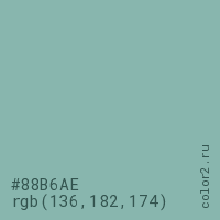 Цвет #88B6AE в цветовой модели RGB обозначается тремя октетами (136, 182, 174) в десятичном формате и #88B6AE в шестнадцатиричном (hex) формате, которые являются интенсивностью красного 136 (hex 88), интенсивность зелёного 182 (hex B6) и интенсивность синего 174 (hex AE).