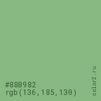 Цвет #88B982 в цветовой модели RGB обозначается тремя октетами (136, 185, 130) в десятичном формате и #88B982 в шестнадцатиричном (hex) формате, которые являются интенсивностью красного 136 (hex 88), интенсивность зелёного 185 (hex B9) и интенсивность синего 130 (hex 82).