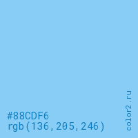 Цвет #88CDF6 в цветовой модели RGB обозначается тремя октетами (136, 205, 246) в десятичном формате и #88CDF6 в шестнадцатиричном (hex) формате, которые являются интенсивностью красного 136 (hex 88), интенсивность зелёного 205 (hex CD) и интенсивность синего 246 (hex F6).