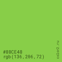 Цвет #88CE48 в цветовой модели RGB обозначается тремя октетами (136, 206, 72) в десятичном формате и #88CE48 в шестнадцатиричном (hex) формате, которые являются интенсивностью красного 136 (hex 88), интенсивность зелёного 206 (hex CE) и интенсивность синего 72 (hex 48).