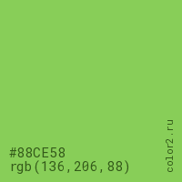 Цвет #88CE58 в цветовой модели RGB обозначается тремя октетами (136, 206, 88) в десятичном формате и #88CE58 в шестнадцатиричном (hex) формате, которые являются интенсивностью красного 136 (hex 88), интенсивность зелёного 206 (hex CE) и интенсивность синего 88 (hex 58).