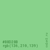 Цвет #88D28B в цветовой модели RGB обозначается тремя октетами (136, 210, 139) в десятичном формате и #88D28B в шестнадцатиричном (hex) формате, которые являются интенсивностью красного 136 (hex 88), интенсивность зелёного 210 (hex D2) и интенсивность синего 139 (hex 8B).