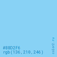 Цвет #88D2F6 в цветовой модели RGB обозначается тремя октетами (136, 210, 246) в десятичном формате и #88D2F6 в шестнадцатиричном (hex) формате, которые являются интенсивностью красного 136 (hex 88), интенсивность зелёного 210 (hex D2) и интенсивность синего 246 (hex F6).