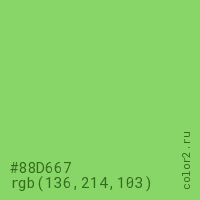Цвет #88D667 в цветовой модели RGB обозначается тремя октетами (136, 214, 103) в десятичном формате и #88D667 в шестнадцатиричном (hex) формате, которые являются интенсивностью красного 136 (hex 88), интенсивность зелёного 214 (hex D6) и интенсивность синего 103 (hex 67).