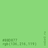 Цвет #88D877 в цветовой модели RGB обозначается тремя октетами (136, 216, 119) в десятичном формате и #88D877 в шестнадцатиричном (hex) формате, которые являются интенсивностью красного 136 (hex 88), интенсивность зелёного 216 (hex D8) и интенсивность синего 119 (hex 77).