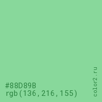 Цвет #88D89B в цветовой модели RGB обозначается тремя октетами (136, 216, 155) в десятичном формате и #88D89B в шестнадцатиричном (hex) формате, которые являются интенсивностью красного 136 (hex 88), интенсивность зелёного 216 (hex D8) и интенсивность синего 155 (hex 9B).