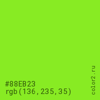 Цвет #88EB23 в цветовой модели RGB обозначается тремя октетами (136, 235, 35) в десятичном формате и #88EB23 в шестнадцатиричном (hex) формате, которые являются интенсивностью красного 136 (hex 88), интенсивность зелёного 235 (hex EB) и интенсивность синего 35 (hex 23).