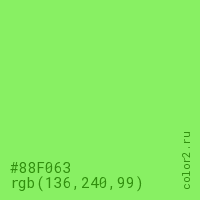 Цвет #88F063 в цветовой модели RGB обозначается тремя октетами (136, 240, 99) в десятичном формате и #88F063 в шестнадцатиричном (hex) формате, которые являются интенсивностью красного 136 (hex 88), интенсивность зелёного 240 (hex F0) и интенсивность синего 99 (hex 63).