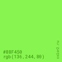 Цвет #88F450 в цветовой модели RGB обозначается тремя октетами (136, 244, 80) в десятичном формате и #88F450 в шестнадцатиричном (hex) формате, которые являются интенсивностью красного 136 (hex 88), интенсивность зелёного 244 (hex F4) и интенсивность синего 80 (hex 50).