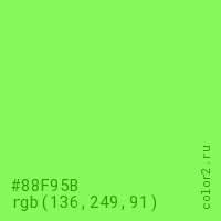 Цвет #88F95B в цветовой модели RGB обозначается тремя октетами (136, 249, 91) в десятичном формате и #88F95B в шестнадцатиричном (hex) формате, которые являются интенсивностью красного 136 (hex 88), интенсивность зелёного 249 (hex F9) и интенсивность синего 91 (hex 5B).