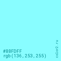 Цвет #88FDFF в цветовой модели RGB обозначается тремя октетами (136, 253, 255) в десятичном формате и #88FDFF в шестнадцатиричном (hex) формате, которые являются интенсивностью красного 136 (hex 88), интенсивность зелёного 253 (hex FD) и интенсивность синего 255 (hex FF).