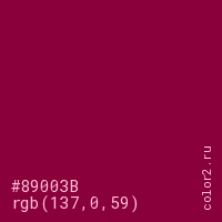 Цвет #89003B в цветовой модели RGB обозначается тремя октетами (137, 0, 59) в десятичном формате и #89003B в шестнадцатиричном (hex) формате, которые являются интенсивностью красного 137 (hex 89), интенсивность зелёного 0 (hex 00) и интенсивность синего 59 (hex 3B).