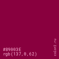 Цвет #89003E в цветовой модели RGB обозначается тремя октетами (137, 0, 62) в десятичном формате и #89003E в шестнадцатиричном (hex) формате, которые являются интенсивностью красного 137 (hex 89), интенсивность зелёного 0 (hex 00) и интенсивность синего 62 (hex 3E).