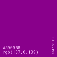 Цвет #89008B в цветовой модели RGB обозначается тремя октетами (137, 0, 139) в десятичном формате и #89008B в шестнадцатиричном (hex) формате, которые являются интенсивностью красного 137 (hex 89), интенсивность зелёного 0 (hex 00) и интенсивность синего 139 (hex 8B).