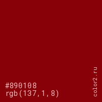 Цвет #890108 в цветовой модели RGB обозначается тремя октетами (137, 1, 8) в десятичном формате и #890108 в шестнадцатиричном (hex) формате, которые являются интенсивностью красного 137 (hex 89), интенсивность зелёного 1 (hex 01) и интенсивность синего 8 (hex 08).