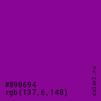 Цвет #890694 в цветовой модели RGB обозначается тремя октетами (137, 6, 148) в десятичном формате и #890694 в шестнадцатиричном (hex) формате, которые являются интенсивностью красного 137 (hex 89), интенсивность зелёного 6 (hex 06) и интенсивность синего 148 (hex 94).