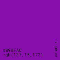 Цвет #890FAC в цветовой модели RGB обозначается тремя октетами (137, 15, 172) в десятичном формате и #890FAC в шестнадцатиричном (hex) формате, которые являются интенсивностью красного 137 (hex 89), интенсивность зелёного 15 (hex 0F) и интенсивность синего 172 (hex AC).