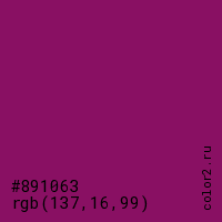 Цвет #891063 в цветовой модели RGB обозначается тремя октетами (137, 16, 99) в десятичном формате и #891063 в шестнадцатиричном (hex) формате, которые являются интенсивностью красного 137 (hex 89), интенсивность зелёного 16 (hex 10) и интенсивность синего 99 (hex 63).